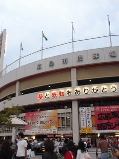 もう先々週のことなんですが広島球場に野球観に行って来きました。まわりに広島もんが多くて弾丸ツアーの誘いについ乗ってしまったのだ。広島市民球場が最後って事なので記念に行っておこうていうのもあってね。記念とか限定モノとかに弱いのかも。そういえば昔、大阪球場の最終戦も観に行ったなぁなんて思い出したりしながら。夜中車飛ばして昼試合見てその足でまた夜帰るという強行日程の弾丸ツアー。せっかく広島来たのだから観光でもと思いつつも着いたら2時間前でも球場前は人が溢れていたので席取りもあるのでサッサと球場入りする。場内で弁当食べたりビール飲んだりしてプレイボールを待つ。